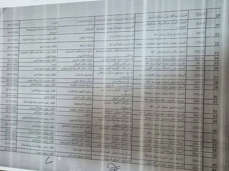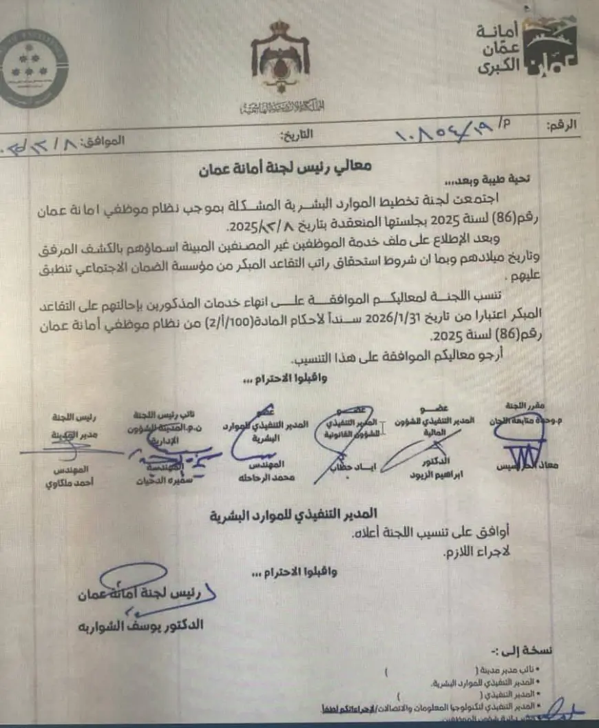 درب الأردن - قرر رئيس لجنة أمانة عمان الكبرى الدكتور يوسف الشواربة، إحالة 53 موظفا إلى التقاعد المبكر اعتبارا من تاريخ 31/1/2026.