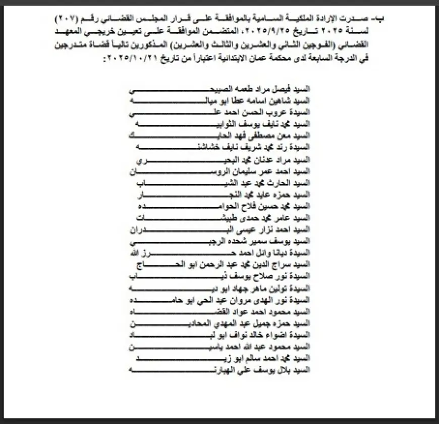 درب الأردن -صدرت اليوم الخميس في الجريدة الرسمية إرادة ملكية سامية تقضي بالموافقة على تعيين عدد من خريجي المعهد القضائي من الفوجين الثاني والعشرين والثالث والعشرين، كقضاة متدرجين في الدرجة السابعة لدى محكمة عمّان الابتدائية، وذلك اعتبارًا من 21 تشرين الأول 2025.