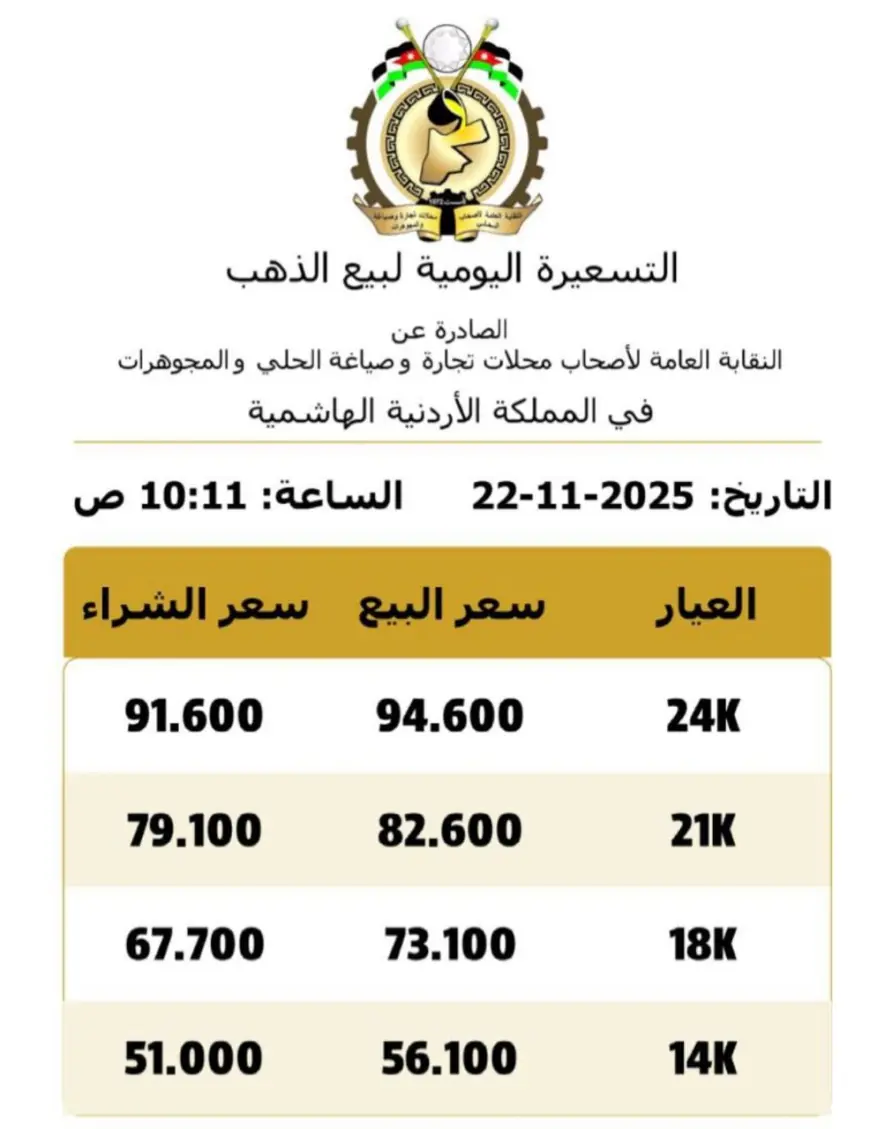 وبحسب النقابة العامة لأصحاب محال تجارة وصياغة الحلي والمجوهرات، ارتفع سعر غرام الذهب من عيار 21 ليصل إلى 82.60 دينار للبيع و79.10 دينار للشراء.