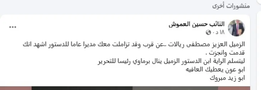 درب الأردن - كتب النائب الدكتور حسين العموش عبر صفحته الرسمية على فيسبوك للزميلين مصطفى الريالات وينال برماوي، حيث كتب في منشوره: