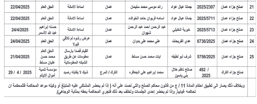 درب الأردن - صدرت، الاثنين، مذكرات تبليغ مواعيد جلسات محاكمات لمشتكى عليهم بتهم مختلفة وقرارات إمهال لحضور جلسات محاكمة.