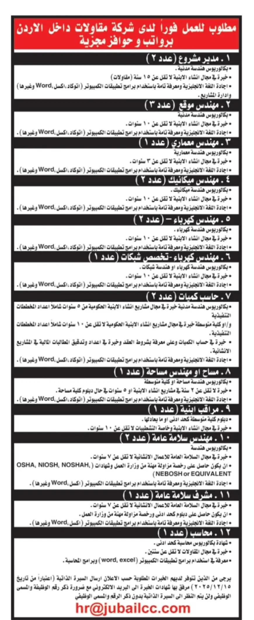 درب الأردن - أعلنت إحدى شركات المقاولات العاملة داخل الأردن عن توفر عدد من الوظائف الهندسية والفنية للعمل الفوري، مع تقديم رواتب وحوافز مجزية.