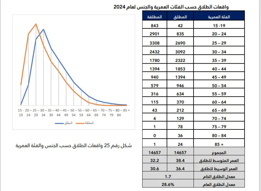 ووفق التقرير، فإن الفئتين العمريتين (25 – 29) و(30 – 34)، الأعلى طلاقا.