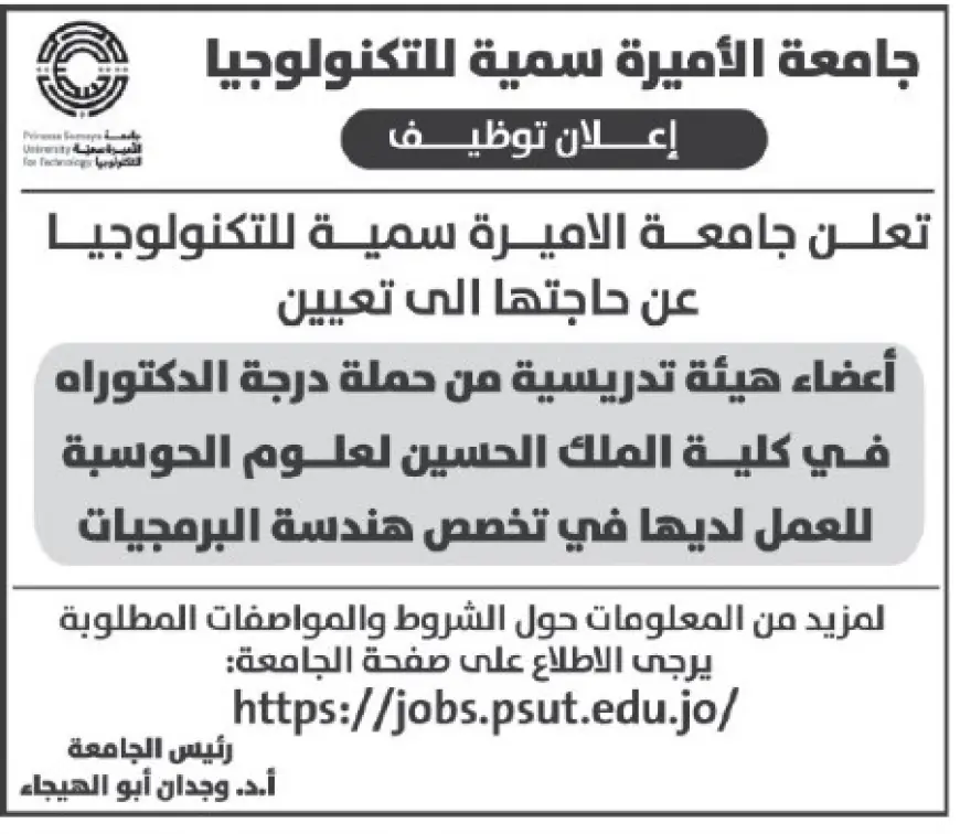درب الأردن - جامعة الأميرة سمية للتكنولوجيا تعلن عن حاجتها إلى أعضاء هيئة تدريسية جدد.