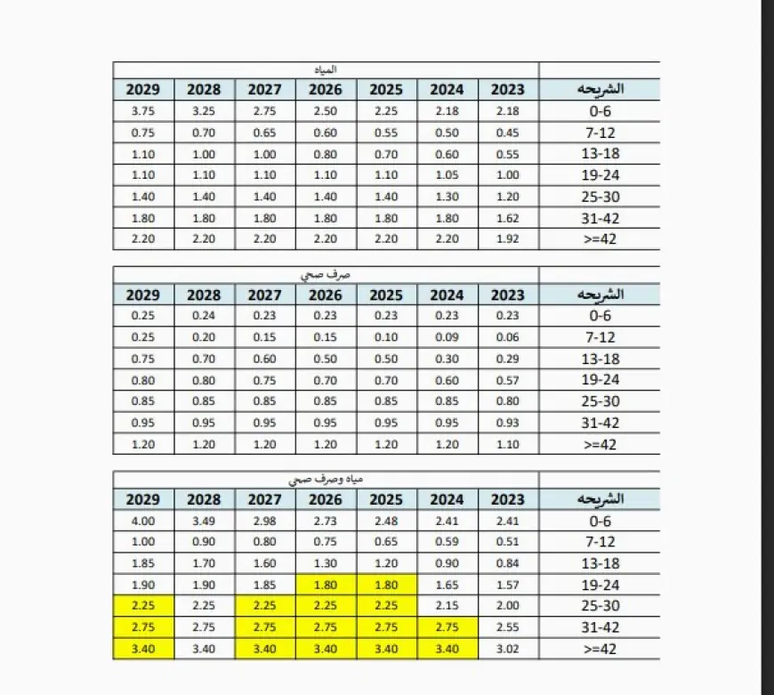 وفيما يلي التعرفة المعتمدة والصحيحة للفترة من عام 2026 ولغاية 2029، وذلك وفق الجدول المبين أدناه.
