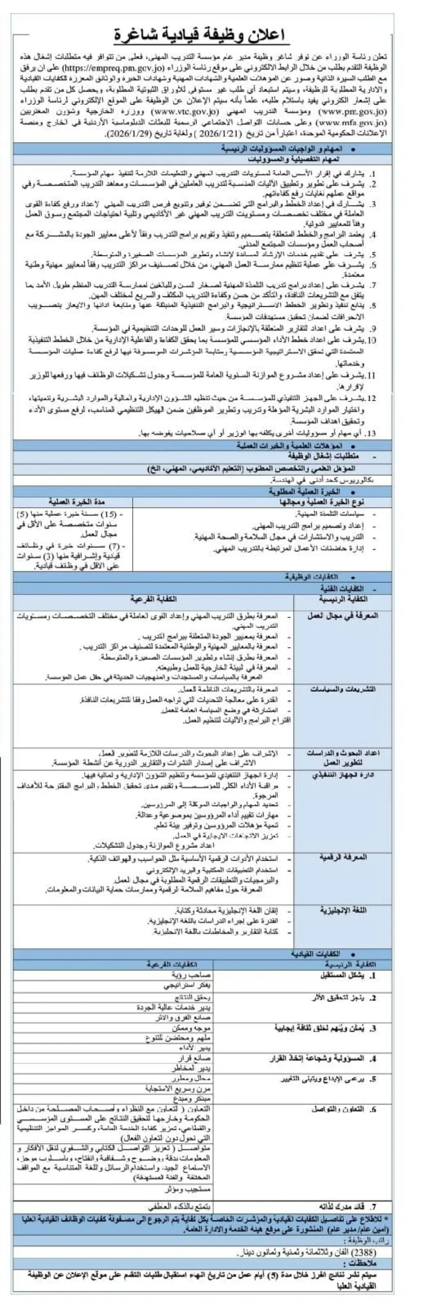 درب الأردن - رئاسة الوزراء تعلن عن وظيفة قيادية شاغرة، مدير عام مؤسسة التدريب المهني.
