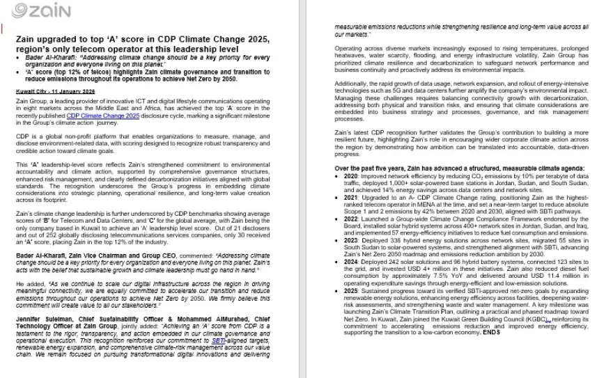 (زين) ترفع تصنيفها في القائمة العالمية للتصدي لتغير المناخ إلى المستوى A