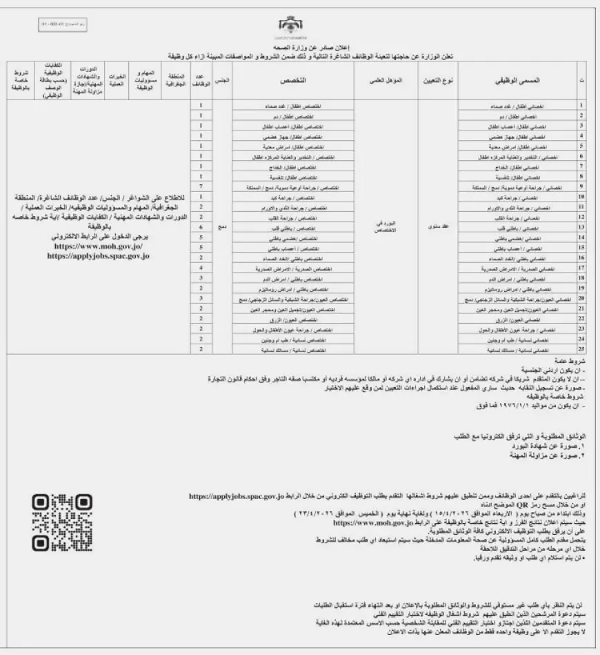 درب الأردن - أعلنت وزارة الصحة اليوم الأحد، عن حاجتها لتعبئة الوظائف الشاغرة التالية.