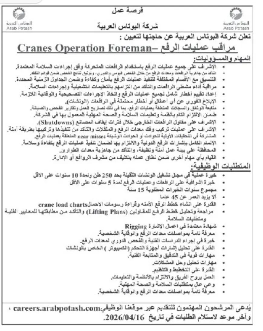 فرصة عمل في البوتاس (للتقديم)