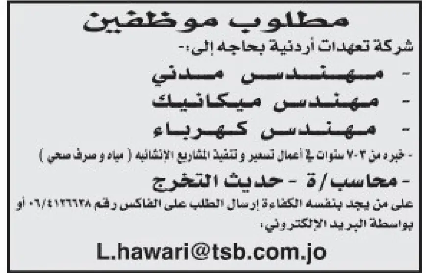 درب الأردن - تعلن شركة تعهدات أردنية عن حاجتها إلى موظفين في التخصصات التالية: