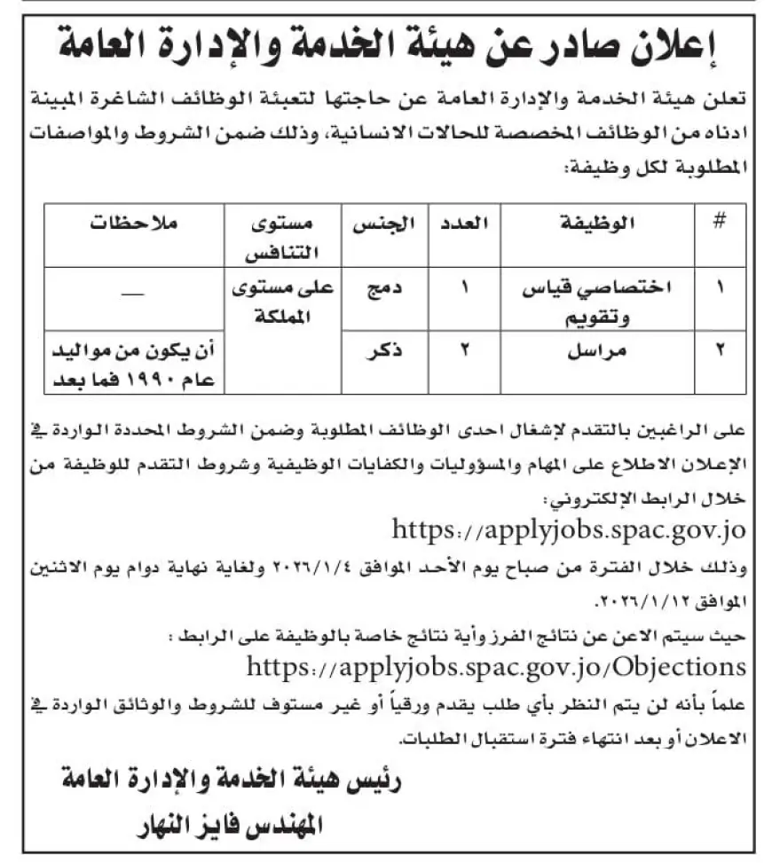 فرص عمل.. مطلوب مراسل واختصاصي قياس وتقويم في هيئة الخدمة والادارة العامة