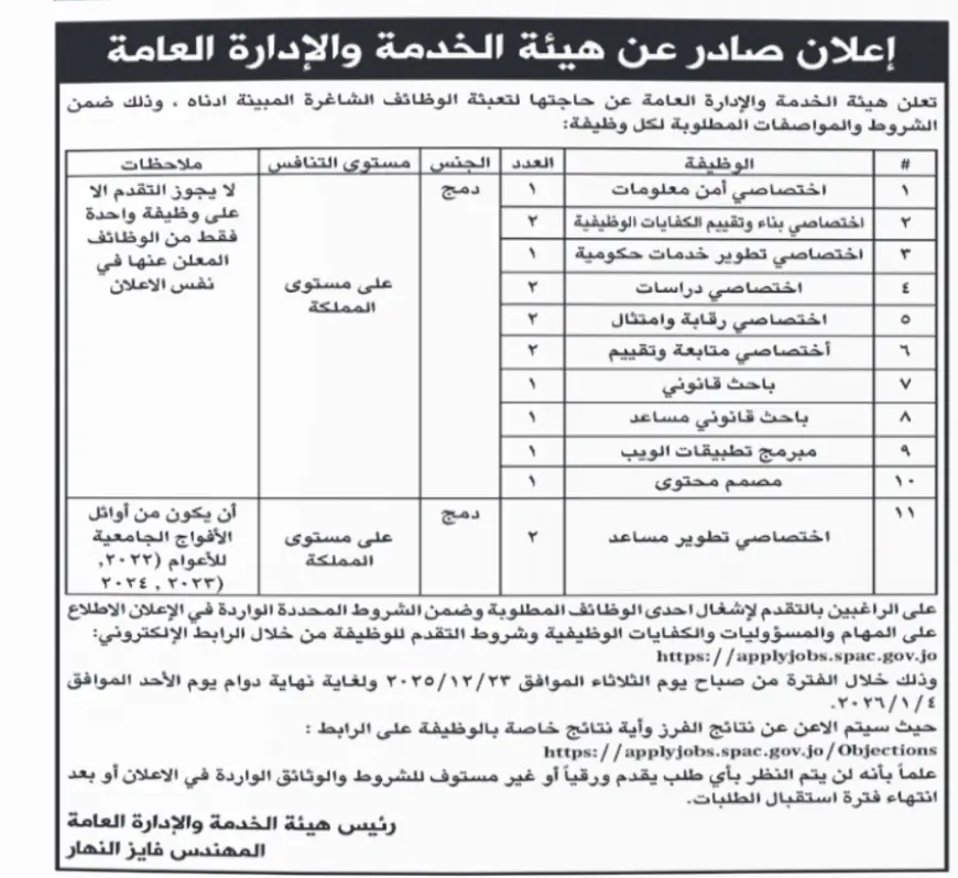 درب الأردن - هيئة الخدمة والإدارة العامة تعلن عن توفر وظائف شاغرة.