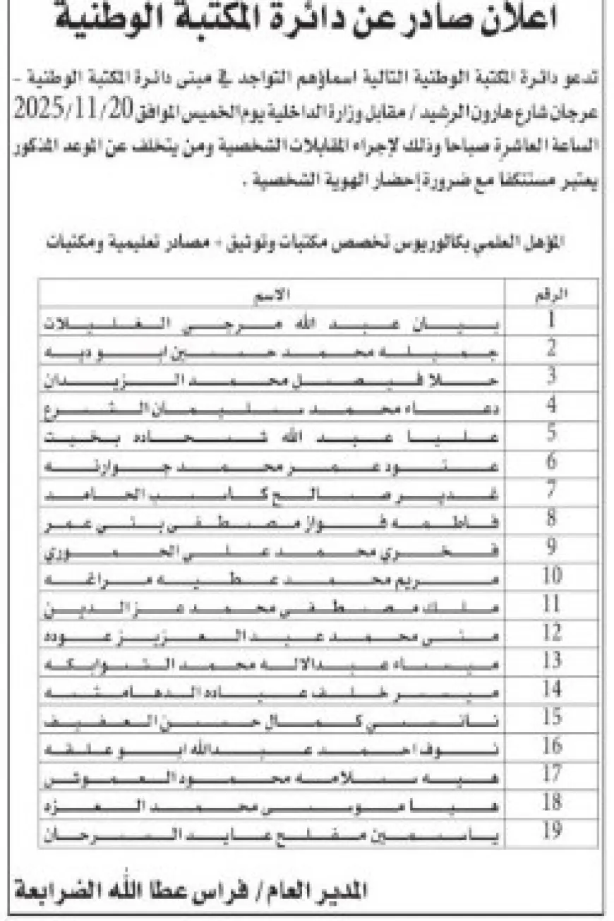 درب الأردن - تدعو المكتبة الوطنية الأسماء التالية لاجراء مقابلات شخصية.