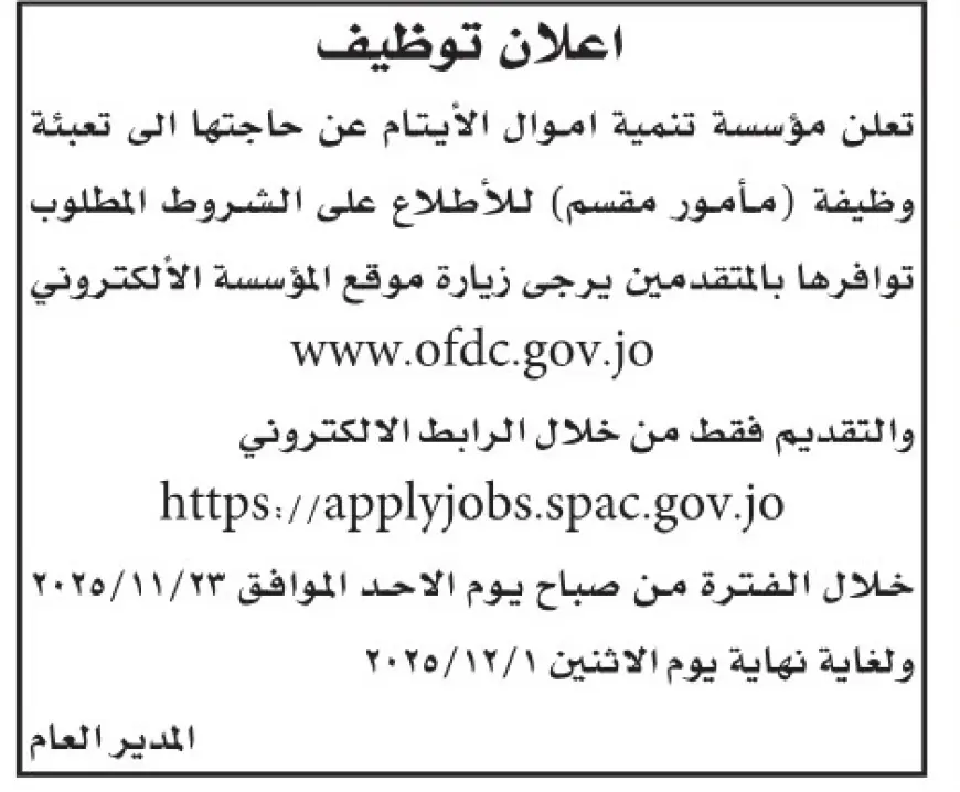 مطلوب مأمور مقسم في مؤسسة تنمية أموال الأيتام