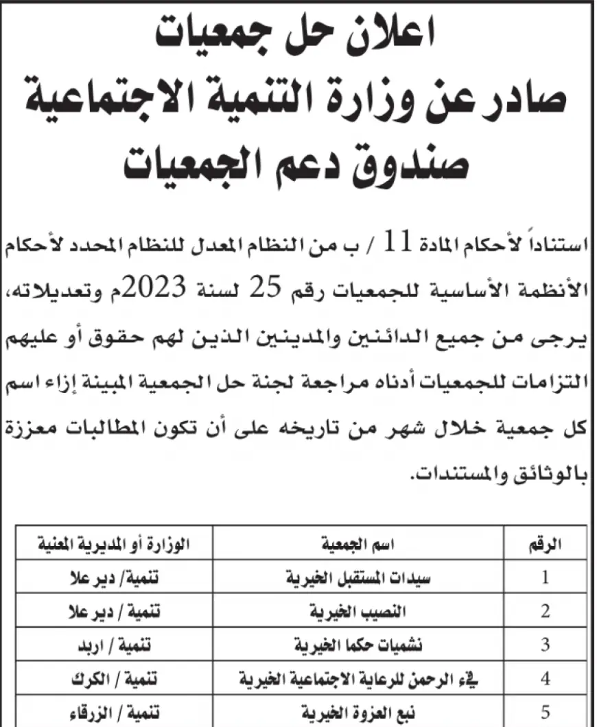 درب الأردن - استناداً لأحكام المادة 11/ب من النظام المعدل للنظام المحدد لأحكام الأنظمة الأساسية للجمعيات رقم 25 لسنة 2023 وتعديلاته، دعت وزارة التنمية الاجتماعية/صندوق دعم الجمعيات، جميع الدائنين والمدينين للجمعيات المعلن عن حلها أدناه، ممن لهم حقوق أو عليهم التزامات مالية، إلى مراجعة لجان حل وتصفية الجمعيات المُبينة إزاء اسم كل جمعية لاتخاذ الإجراءات اللازمة.