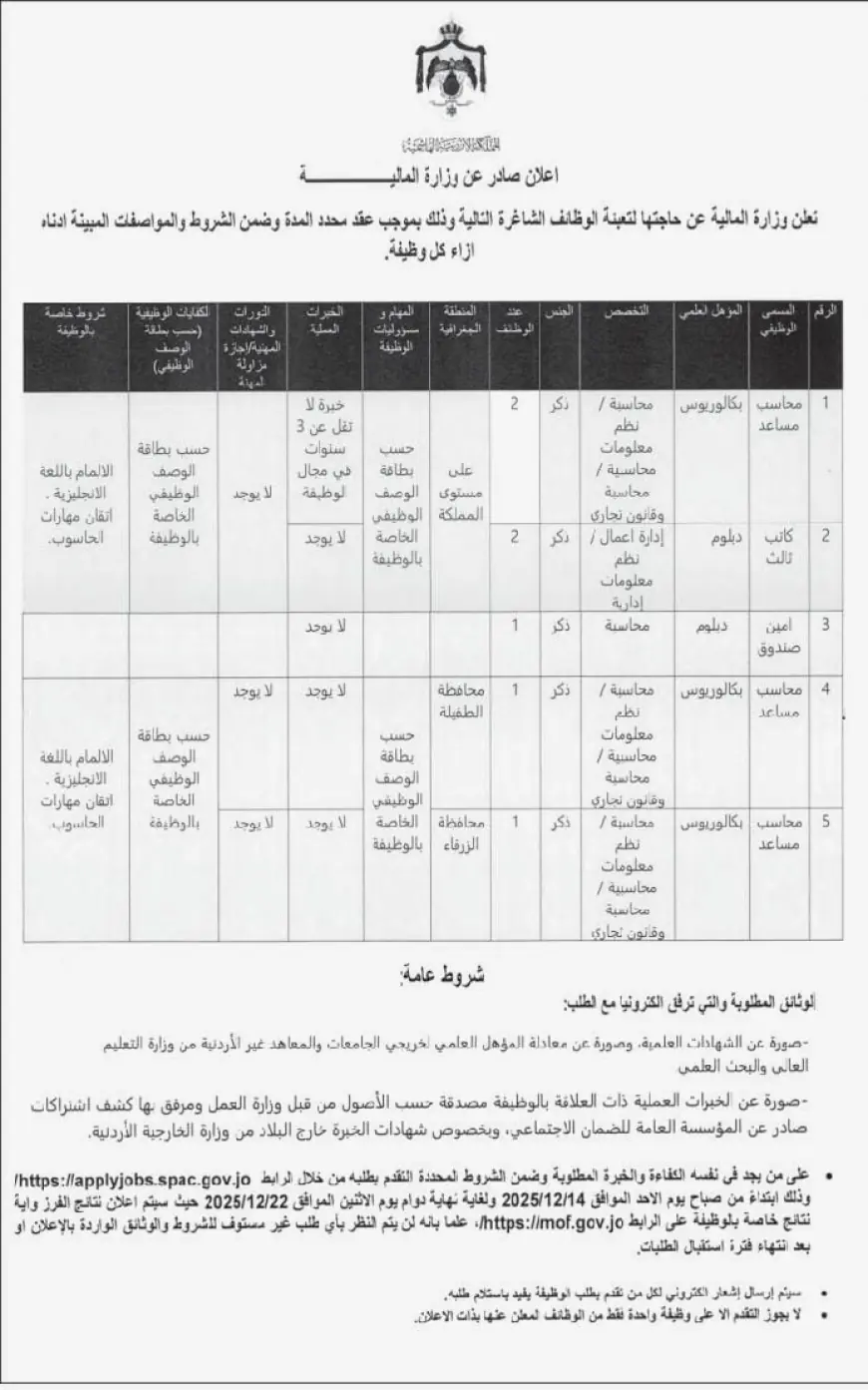 درب الأردن - أعلنت وزارة المالية الأردنية عن توفر عدد من الوظائف الشاغرة التي سيتم تعبئتها وفق نظام العقود محددة المدة، وذلك ضمن شروط ومواصفات محددة لكل وظيفة.