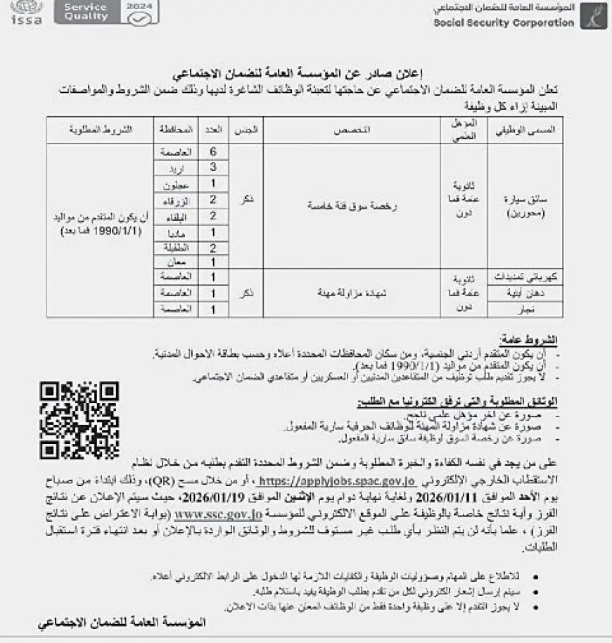 درب الأردن - أعلنت مؤسسة الضمان الإجتماعي عن حاجتها لتعبئة الوظائف الشاغرة لديها.