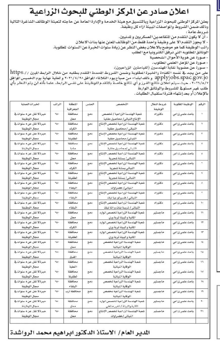 درب الأردن - وظائف شاغرة في المركز الوطني للبحوث الزراعية، وتاليا الوظائف والشروط.