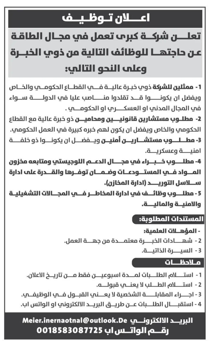 درب الأردن - أعلنت شركة كبرى تعمل في مجال الطاقة عن حاجتها للوظائف التالية من ذوي الخبرة.