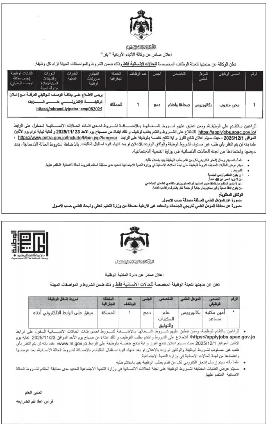 درب الأردن - أعلنت وكالة الأنباء الأردنية "بترا" والمكتبة الوطنية عن وظائف شاغرة لديها .