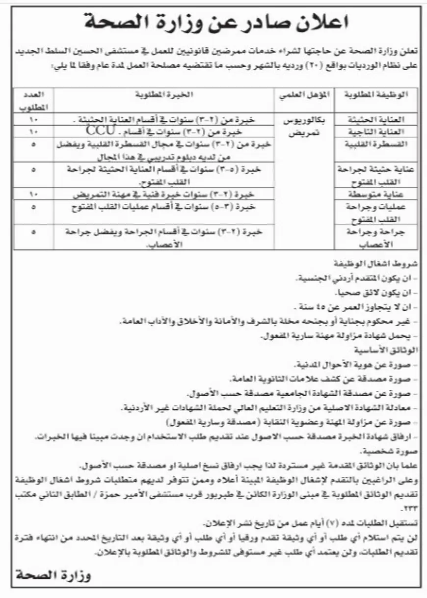 درب الأردن - أعلنت وزارة الصحة عن حاجتها لتعيين ممرضين قانونيين على نظام شراء الخدمات في مستشفى الحسين السلط الجديد.