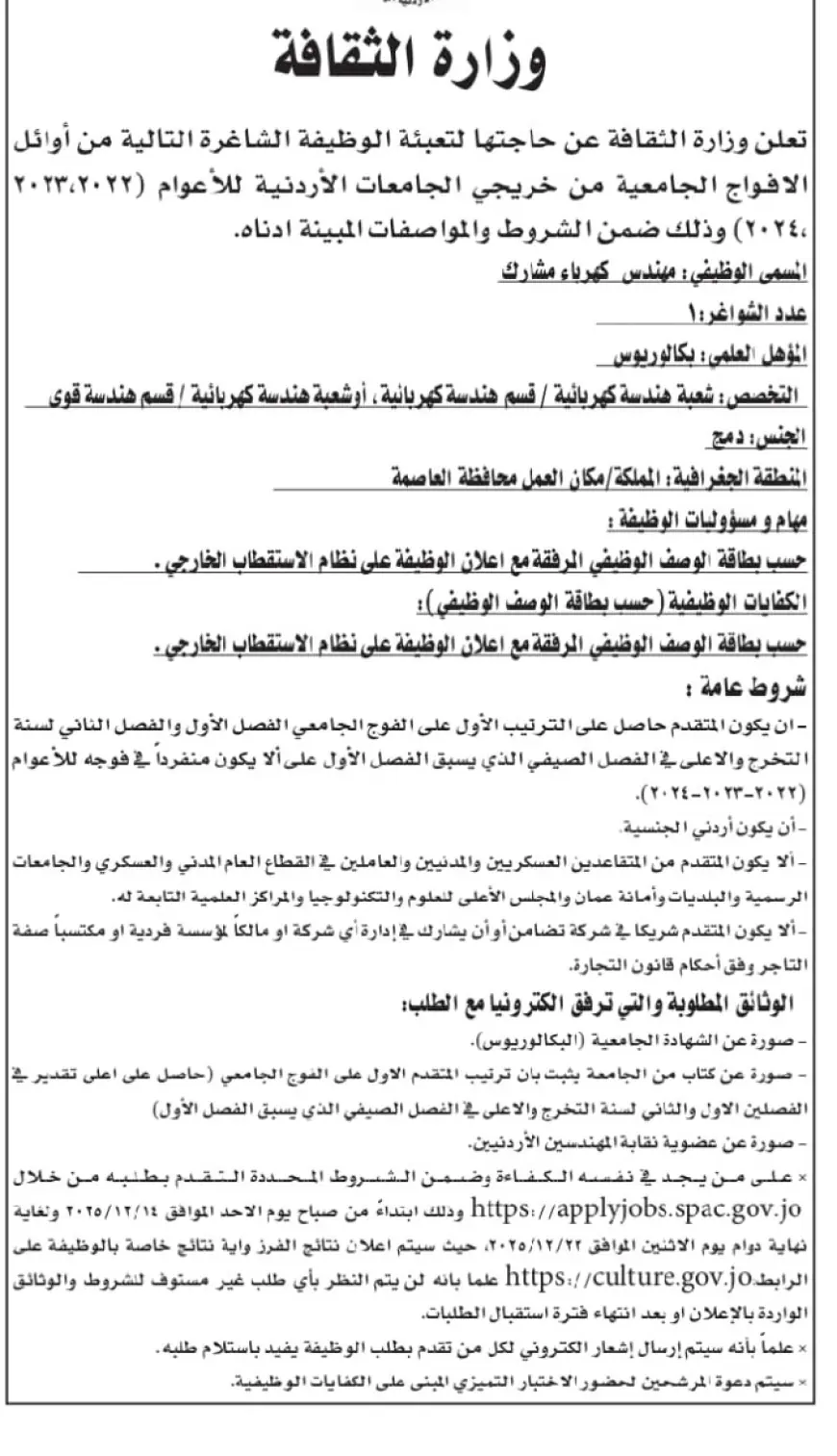 درب الأردن - أعلنت وزارة الثقافة عن حاجتها لتعبئة الشواغر، وذلك ضمن الشروط والمواصفات المبينة أدناه.