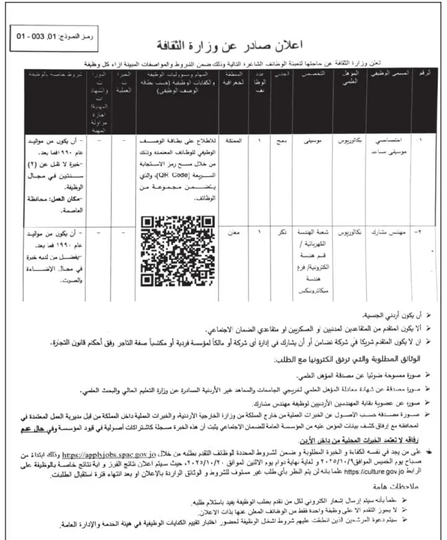 درب الأردن - أعلنت وزارة الثقافة عن حاجتها لتعبئة الشواغر التالية، وبحسب الشروط والمواصفات.