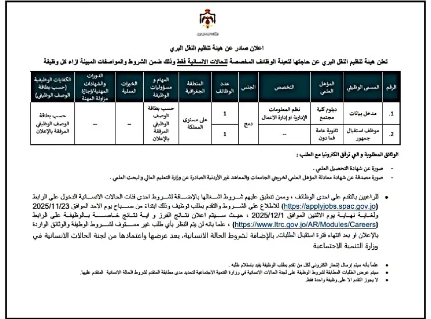 درب الأردن - أعلنت هيئة تنظيم النقل البري، عن حاجتها لتعبئة الوظائف المخصصة للحالات الإنسانية فقط ولحملة الدبلوم والثانوية العامة.