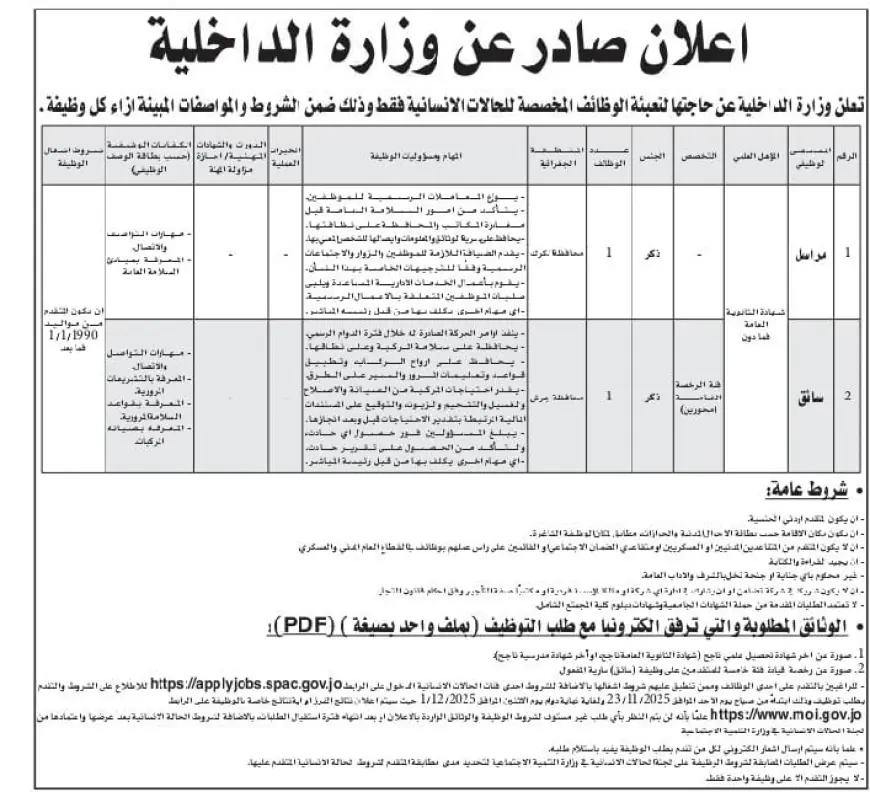 درب الأردن - أعلنت وزارة الداخلية عن حاجتها لتعبئة الوظائف المخصصة للحالات الإنسانية.