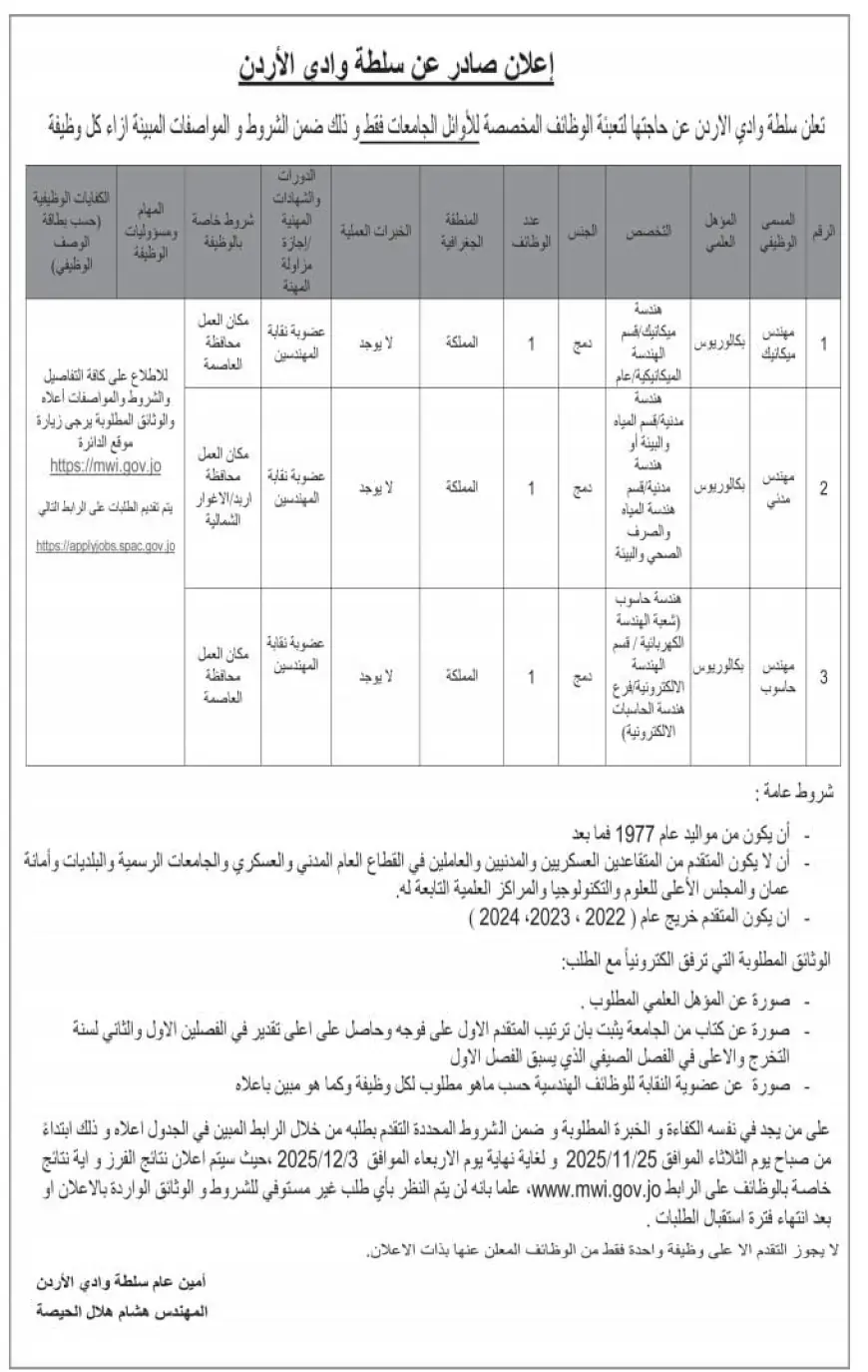 درب الأردن - أعلنت سلطة وادي الأردن عن وظائف مخصصة لأوائل الجامعات.