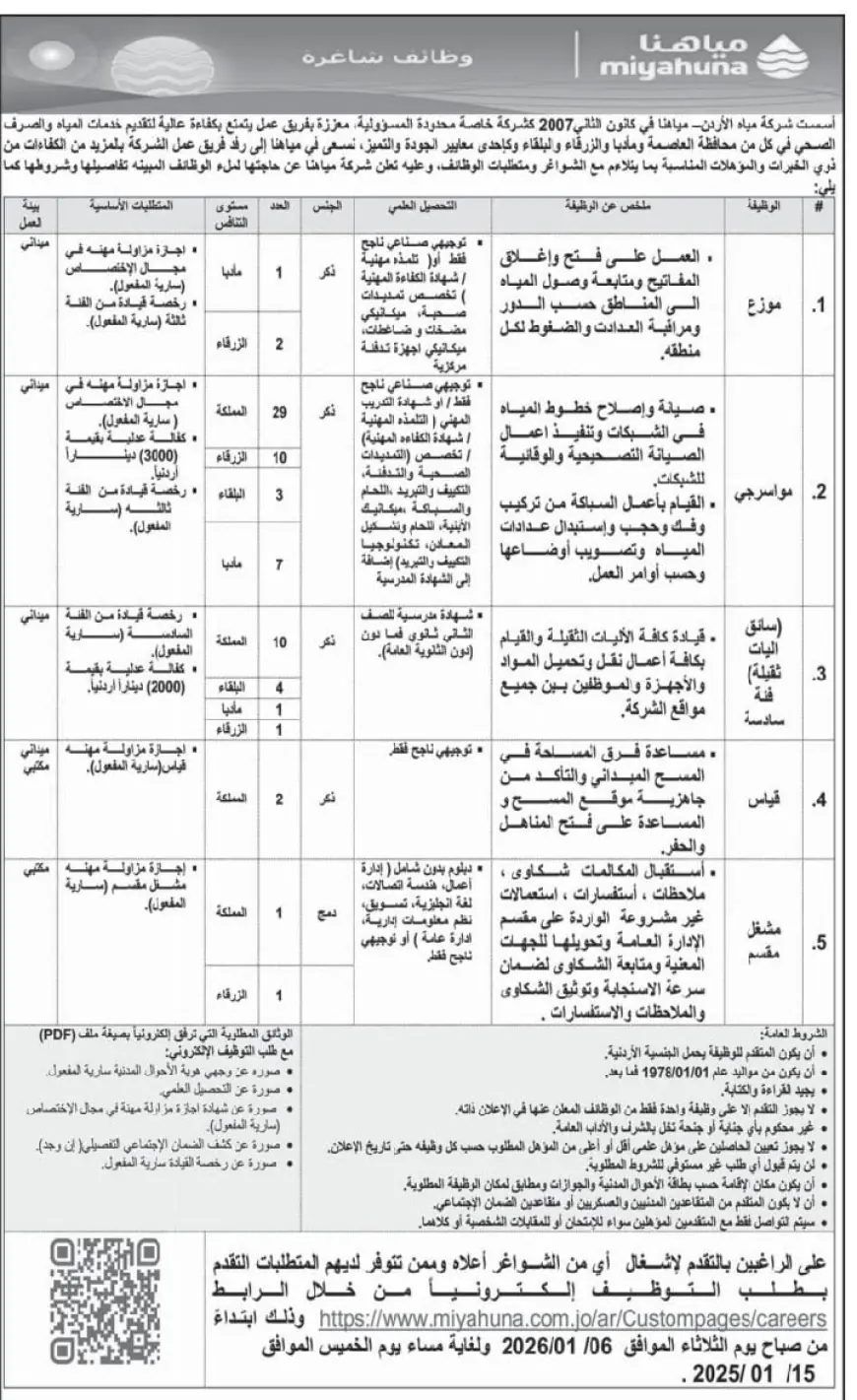 5 وظائف شاغرة في شركة مياهنا.. سارعوا للتقديم
