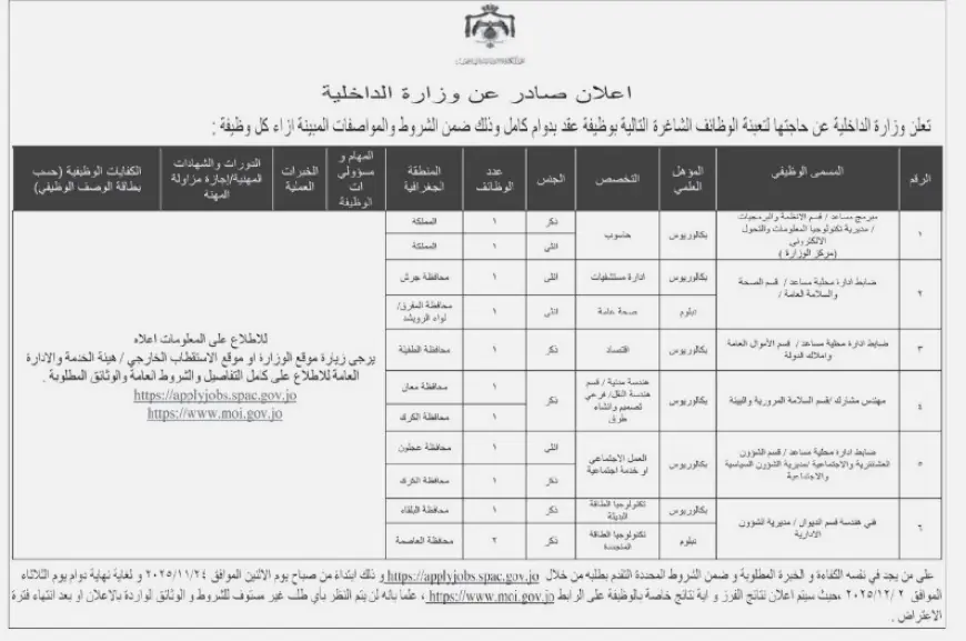 درب الأردن - أعلنت وزارة الداخلية عن حاجتها لعبئة الشواغر الوظيفية بعقد ودوام كامل.