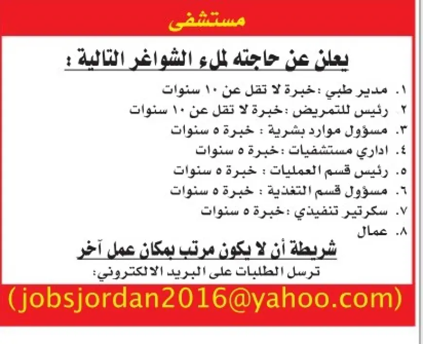 درب الأردن - أعلن أحد المستشفيات في الأردن عن توفر 8 شواغر وظيفية ضمن كادره الطبي والإداري، في خطوة تهدف إلى تعزيز جودة الخدمات الصحية وتوسيع فريق العمل المتخصص.
