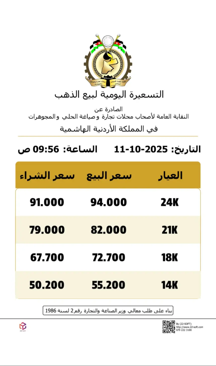 وبحسب النشرة اليومية الصادرة عن النقابة العامة لأصحاب محلات تجارة وصياغة الحلي والمجوهرات، سجل سعر غرام الذهب لعيار 24 نحو 94.00 دينارًا، وعيار 18 حوالي 72.70 دينارًا، فيما بلغ سعر غرام الذهب من عيار 14 نحو 55.20 دينارًا، وذلك لغايات البيع.