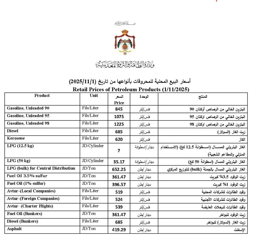 وعليه، قرّرت لجنة تسعير المشتقات النفطية تعديل سعر بيع البنزين أوكتان 90 ليصبح (845) فلسا/لتر بدلاً من (855) فلسا/لتر، وسعر بيع البنزين أوكتان 95 ليصبح (1075) فلسا/لتر بدلاً من (1080) فلسا/لتر، وتثبيت سعر بيع الديزل عند (685) فلسا/لتر، مع الاستمرار في تثبيت سعر بيع الكاز عند (620) فلسا/لتر، والإبقاء على سعر بيع أسطوانة الغاز المنزلي (12.5 كغم) عند (7) دنانير/ أسطوانة.