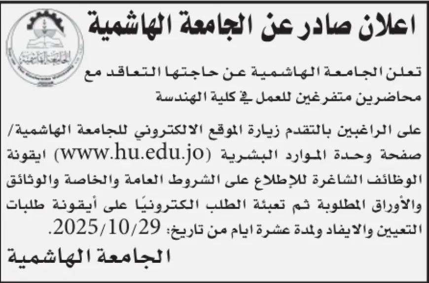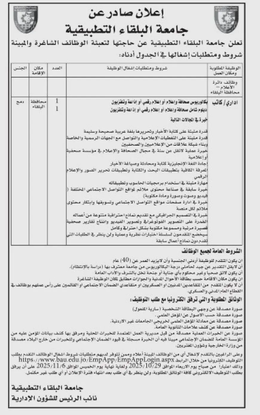 درب الأردن - أعلنت كل من الجامعة الهاشمية وجامعة البلقاء التطبيقية عن توفر عدد من الوظائف الشاغرة، وذلك وفقًا لشروط ومعايير محددة وضعتها الجامعتان ضمن إعلاناتهما الرسمية.